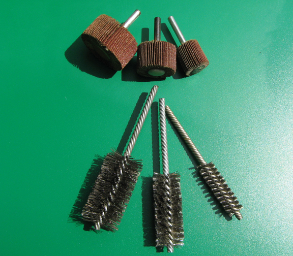 Stainless Steel Wire Brushes(Bottom of photograph) The double-spiral stainless steel power wire brushes with .006 diameter wire are sized 1/16" larger than the tube sheet hole. Once (in and out) will clean the tube sheet hole without removing tube sheet material or deforming the hole. |